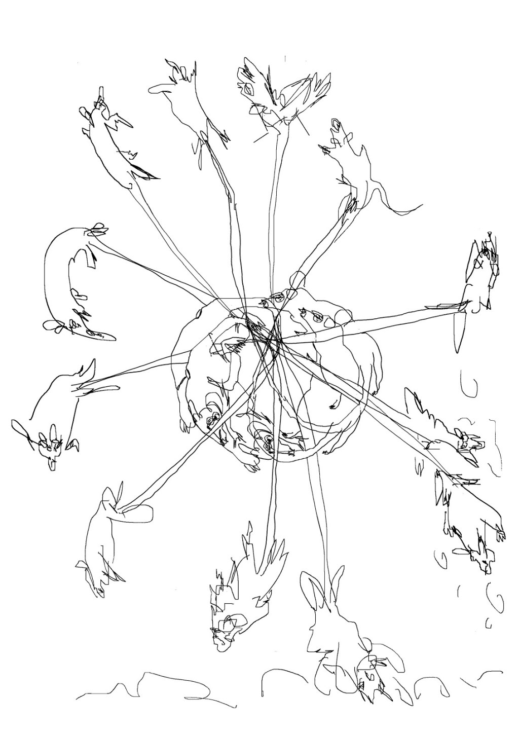 Ezért ahelyett, hogy kutatóként különféle módszertanokkal metaforákat szednék szét és próbálnék valami objektív, általános érvényű dolgot kijelenteni, inkább metafórát alkottam (vagyis spontán módon eszembe jutott) – a patkánykirályt ami a társadalmit és a szomatikust, a zsigerit összekapcsoló függések rendszere. Egy absztrakt gépezet testekből és jelölőkből, amit érzés működtet. A struktúra amit láttam a függés volt, a kötőanyag a tekintélyelvűség, és azt írom le hogyan termelődött újra mind a függés mind a kötőanyag.